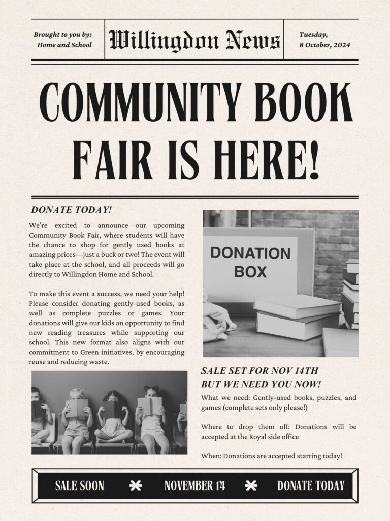 We’re excited to announce our upcoming Community Book Fair, where students will have the chance to shop for gently used books at amazing prices—just a buck or two! The event will take place at the school, and all proceeds will go directly to Willingdon Home and School. To make this event a success, we need your help! Please consider donating gently-used books, as well as complete puzzles or games. Your donations will give our kids an opportunity to find new reading treasures while supporting our school. This new format also aligns with our commitment to Green initiatives, by encouraging reuse and reducing waste.